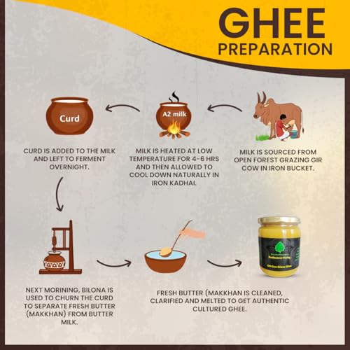 Milk from udder is kept in steel/iron kadai, utensil and boiled. After boiling, milk is left to get lukewarm temperate where curd culture is added and kept for overnight settling. Next day this curd is churned by bilona machine and white butter is separated along with buttermilk This butter is then melted in Iron kadai to get ghee.
