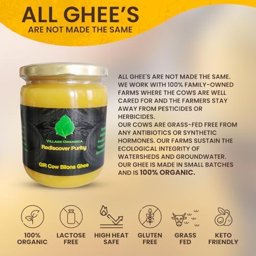Village Organica Gir cow ghee is nutritious, healthy, pure and unadulterated ghee made from the milk of Indian native breed GIR cow. Its A2 cow Ghee with No Preservatives, No Chemicals, No Artificial essence. Our Ghee is hand made via the tradition Bilona method. Gir Cow Cultured Ghee is gluten free and easy to digest. Our Ghee is made from milk collected from grass-fed desi Gir cows. Grazing upon medicinal grasses in pastures makes the milk of desi Gir cows a nectar. Now this nectar gives us best of ghee. These cows are grass-fed and are not factory-farmed and are free from cross-breeding, which gives our Ghee its special, natural qualities.
