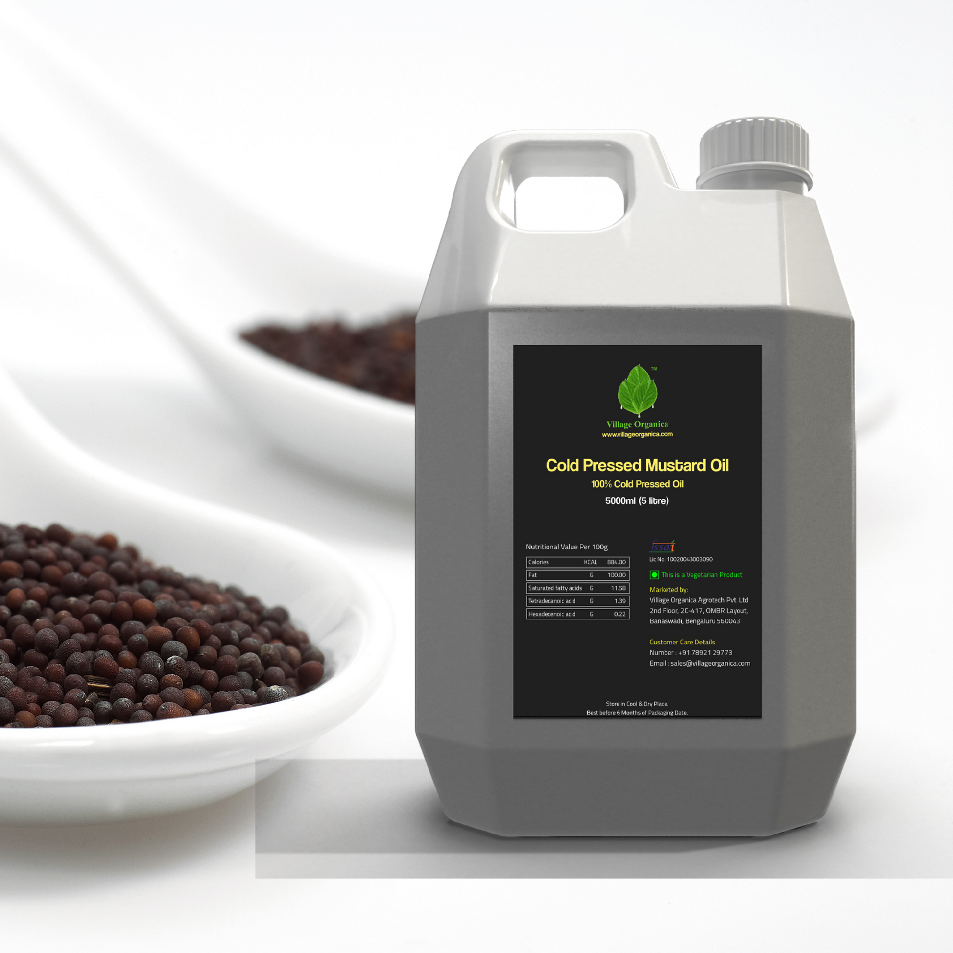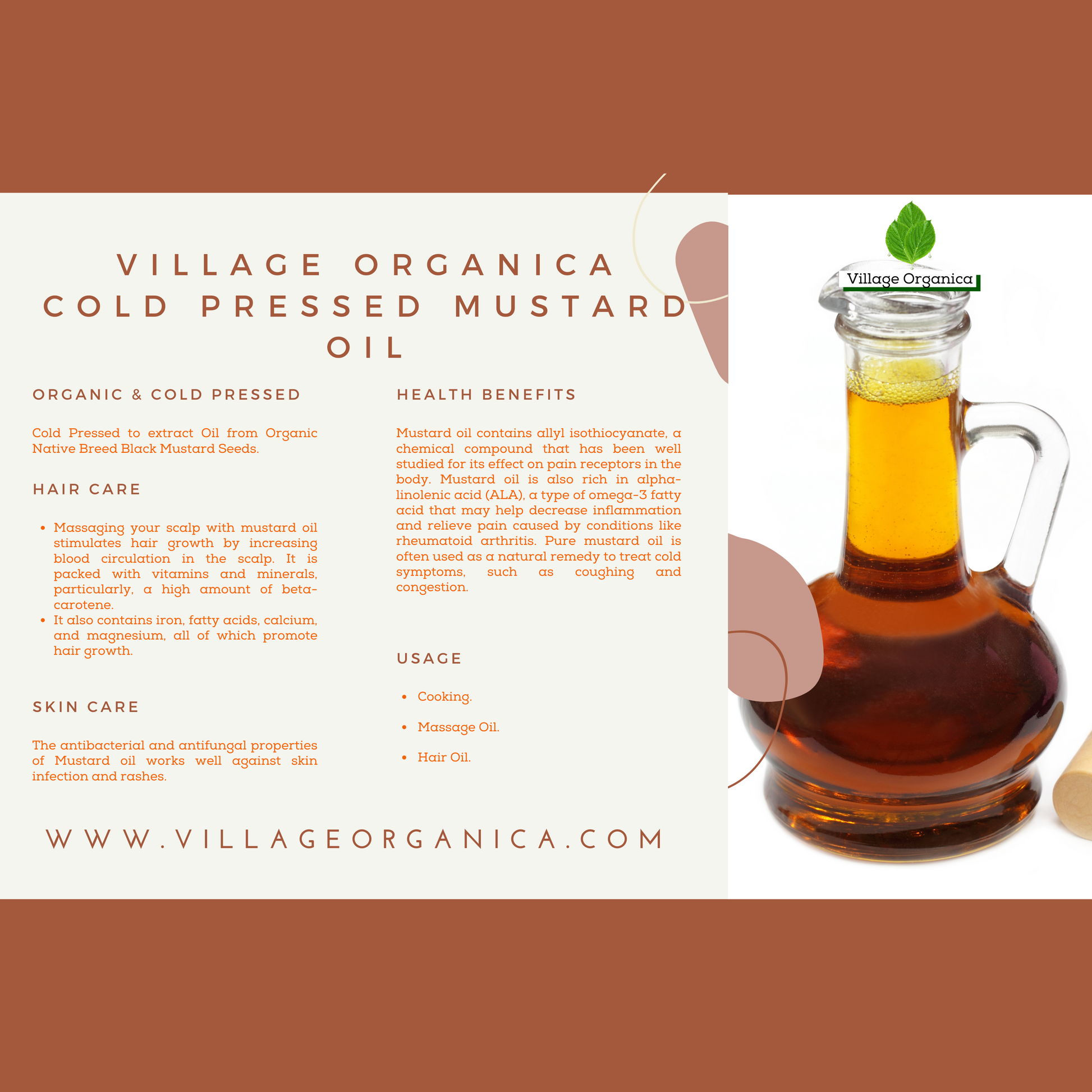 Village Organica Cold Pressed Mustard Oil is 100% Cold Pressed without adulteration from, Organically Grown, Mustard seeds. Oil is extracted only once from the mustard Seeds, to maintain the original Aroma, Taste and Purity. Mustard oil (known as “Sarso ka tel” in Hindi) is a traditional edible oil used in India for centuries. Mustard oil is used in Indian cooking for preparing pickles to dry vegetables to curries to fried foods.