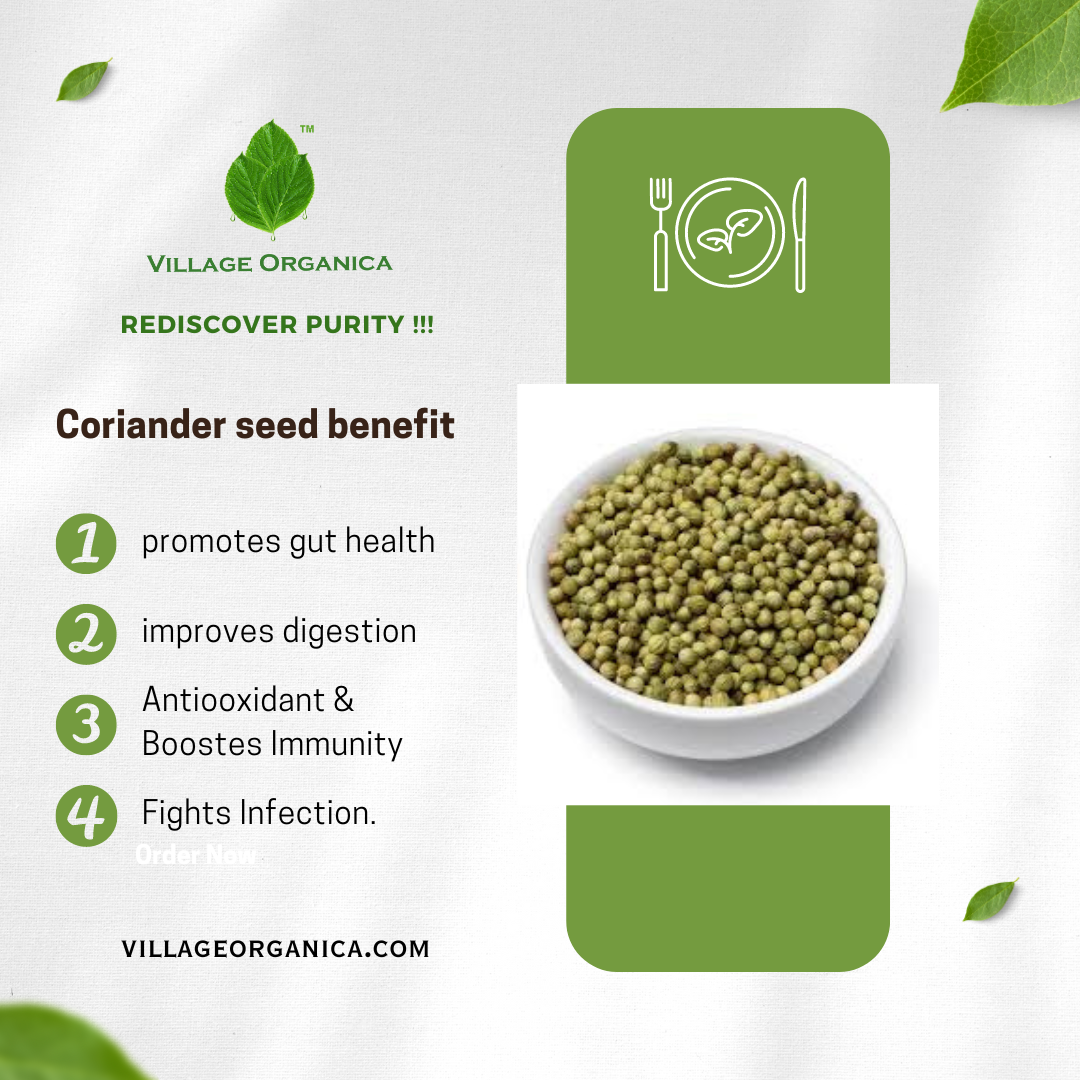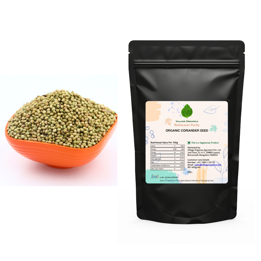 Village Organica Coriander Seeds are native (Desi Breed) seeds typically grown by farmers for personal consumption only. These Coriander seeds are slightly greener in colour and smaller in size compared to the typical coriander seeds available. These authentic coriander seeds are nutritious and pack the authentic aroma. Grown organically without the use of synthetic fertilizers or pesticides, these seeds are a healthier choice for those looking to add a burst of flavour to their dishes. Coriander seeds are a staple in Indian cuisine, used in curries, chutneys, and masalas. They have a warm, earthy flavour with a hint of citrus that complements a variety of dishes. These seeds can be dry-roasted and ground into a powder or used whole to infuse oils and dressings. With their robust aroma and flavour, Village Organica Coriander Seeds are a must-have for any spice enthusiast or home cook looking to elevate their culinary creations with an authentic touch.